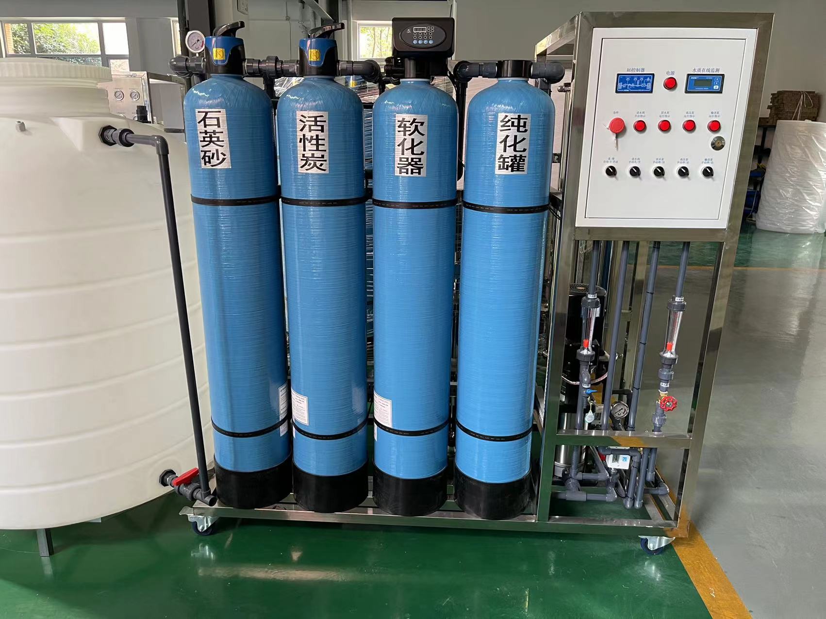 原水→原水箱→原水(shuǐ)增壓泵→石英砂過濾器→活性(xìng)炭過濾器→軟化水(shuǐ)過濾器→阻垢劑投加設備→精細過濾(lǜ)器→高壓泵→反滲透主機(單級或者雙級)→CQ2脫氣塔→中心水箱→中心水泵→edi設備→精混(hún)床→超純(chún)水。